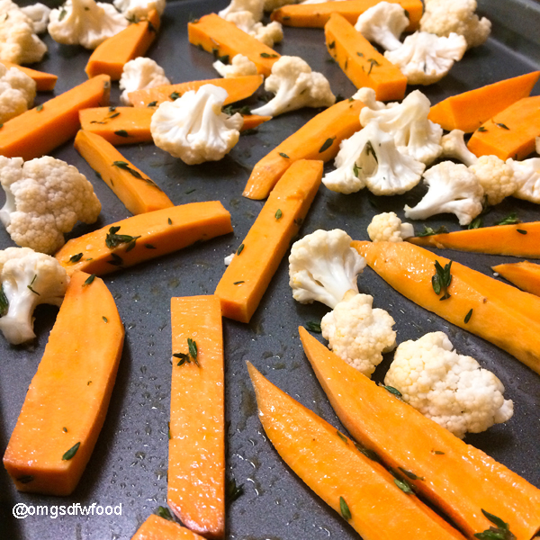 On a large sheet pan, add the sweet potato sticks and cauliflower. Drizzle with one tablespoon of olive oil. Sprinkle fresh thyme over the sweet potato and cauliflower. Season with salt, and toss with your hands to coat all the veggies. Spread the sweet potato and cauliflower evenly across the spreadsheet, and set aside.