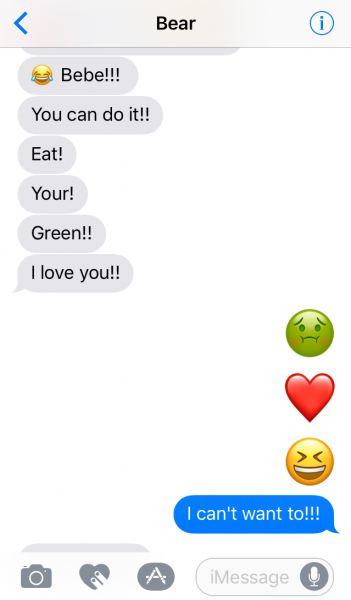 Now, as you recall, I have an aversion to sad, little salads. However, in my efforts to make better choices, I am adding more greenery to my daily intake – reluctantly so (as demonstrated in this recent text from Bear) – but nevertheless leafy greens have made an appearance on my plate.